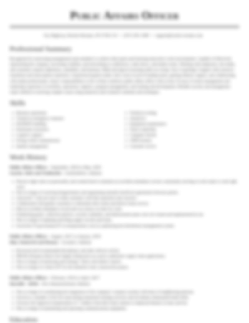The following Public Relations Officer sample resume is created using Flexi Resume Builder. Police officer resume PDFs guard their formatting. This Public Relation Officer resume will give you a quick start in creating a unique resume for your job application.