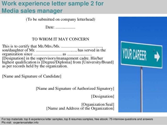 Experience Certificate Format For Sales Manager. Any authorized person like supervisor, HR manager or director etc, can issue experience certificate. Work Experience Certificate - Free download as PDF File (.pdf), Text File (.txt) or read online for free. © Attribution Non-Commercial (BY-NC).